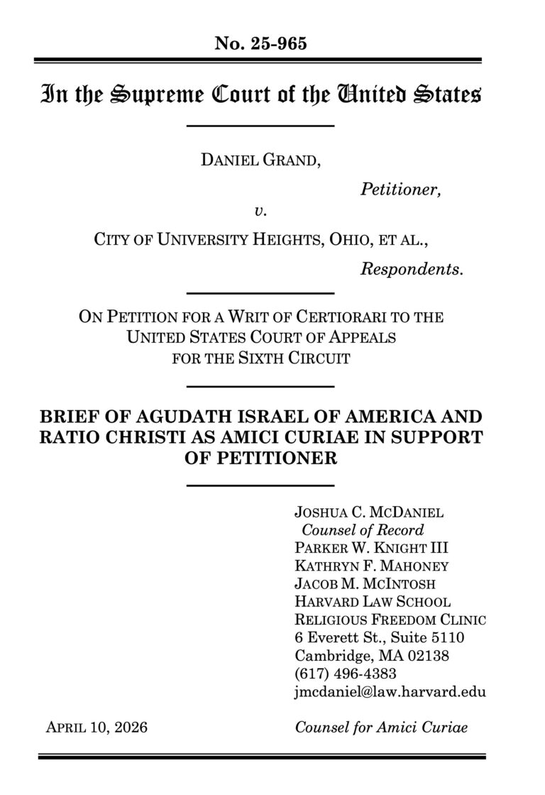 Agudath Israel of America has filed an amicus curiae (friend of the court) brief, asking the Supreme Court of the United States to hear the case of Grand v. City