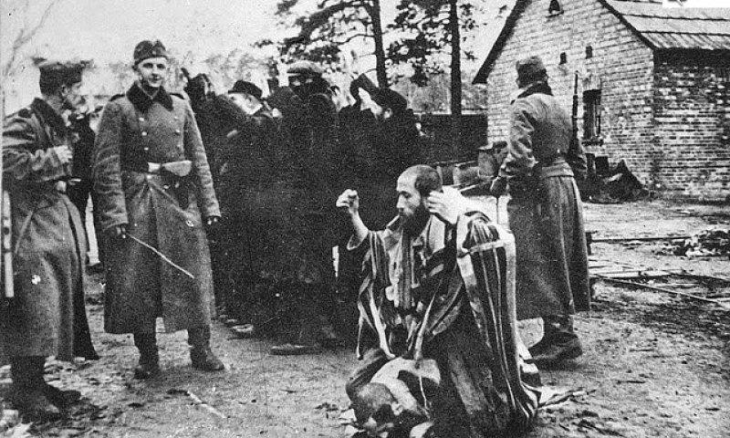 He is seen kneeling before the Nazis in what was known as the “horse and rider” position—a method used by the Nazis to degrade Jews. The photograph was reportedly found by a local Polish youth and later passed on to Jews who returned to the town after the war.