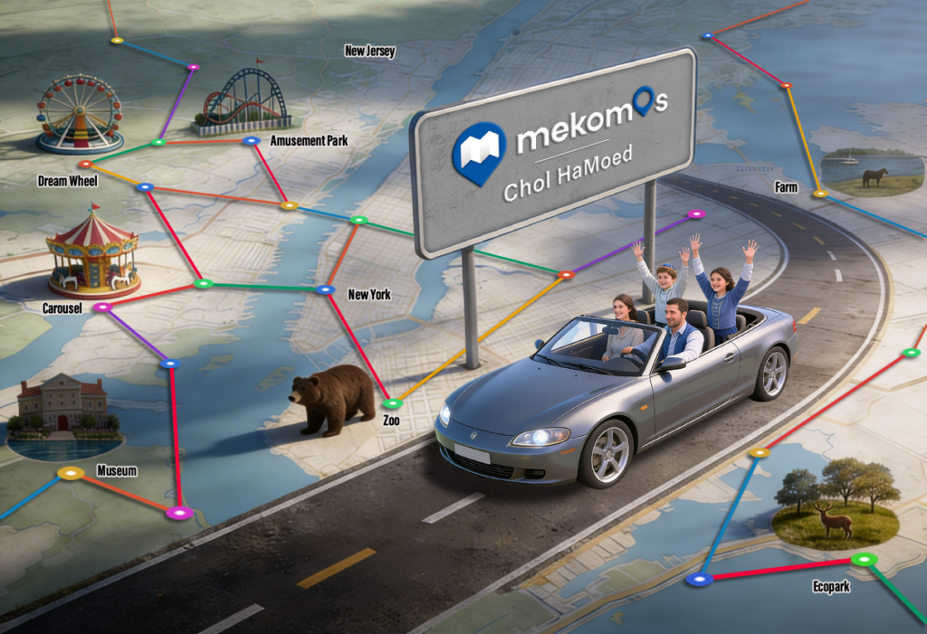 Mekomos.com (מקומות — “places”) is a searchable directory built specifically for frum families. Their Chol Hamoed section has dozens of vetted activities and venues organized by category — amusement parks, zoos, museums, family fun centers, concerts, parks, and indoor activities — all filterable by distance from your location. No more guessing. No more scrolling.